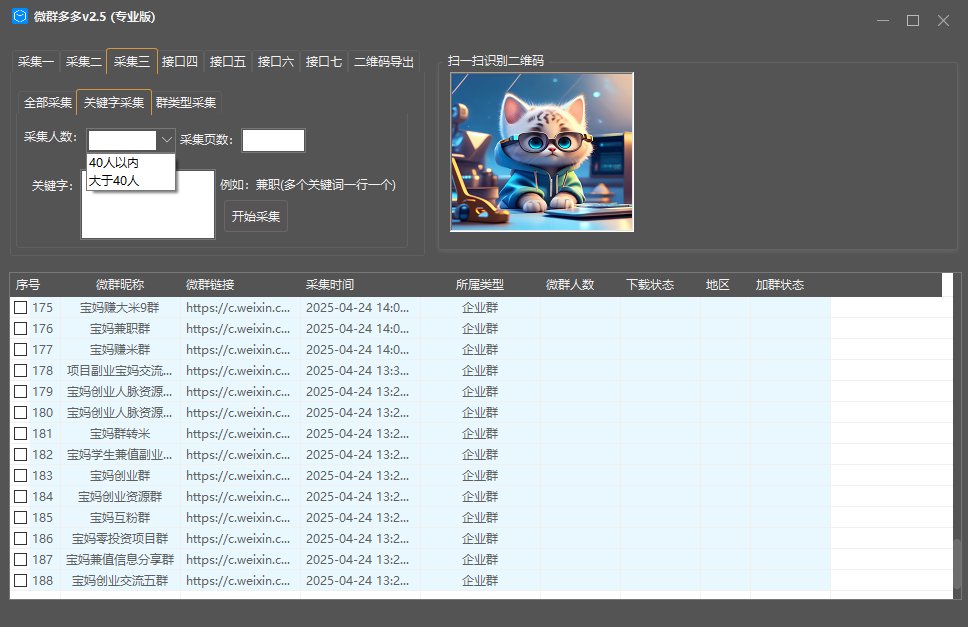 微信群采集定制版二维码获取器电脑版PC端采集微信群神器目前市面采集界天花板级别产品微信群、企业群即刻下载无需登录微信,做到“0”封号长久更新,支持技术反馈支持关键字筛选二维码获取器下载地址:https...