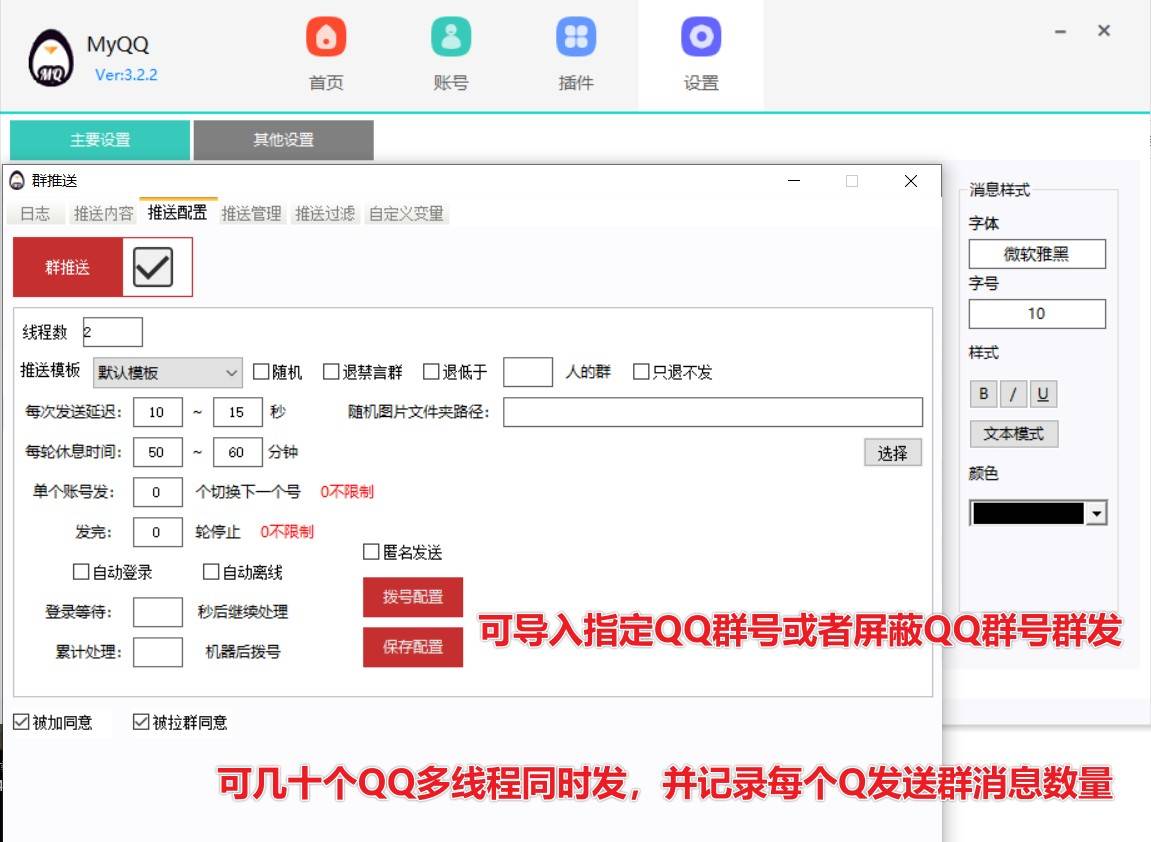 站长亲测封号几率比较低的多线程QQ群发软件可在MyQQ系列框架激活不卡顿,可几十个QQ同时群发群消息上手容易,软件稳定,简单易懂下载地址:https://www.123pan.cn/s/BzxtVv-BB7Y.html