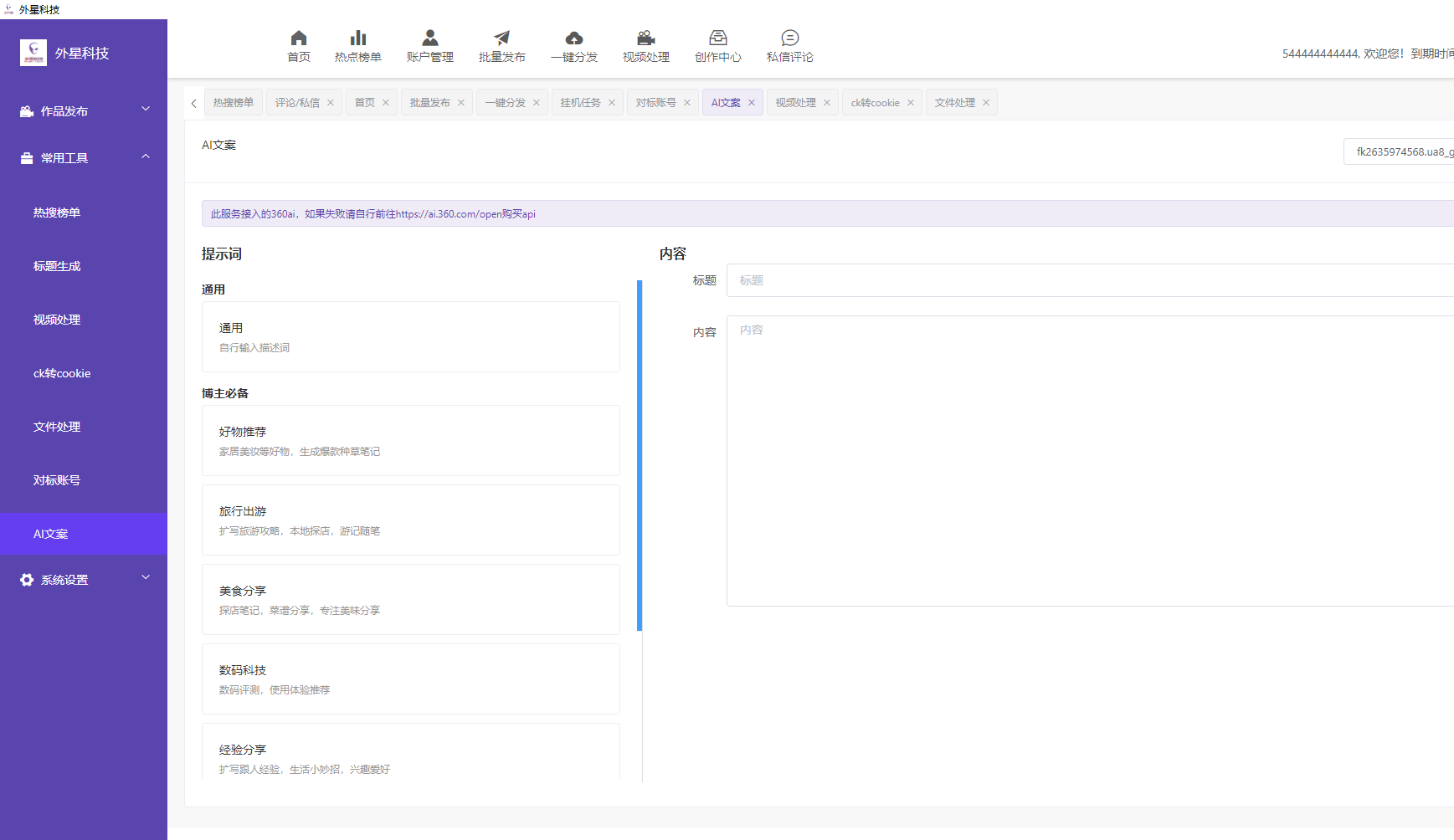 软件详细功能如下:DY AI矩阵克隆系统发布工具-购买自动发下载地址和卡密1.一键指定作者并下载克隆对方图文视频作品后自动去重处理,进行多个小红书矩阵账号批量发布.(可以提取同行爆火的笔记,结合AI智...