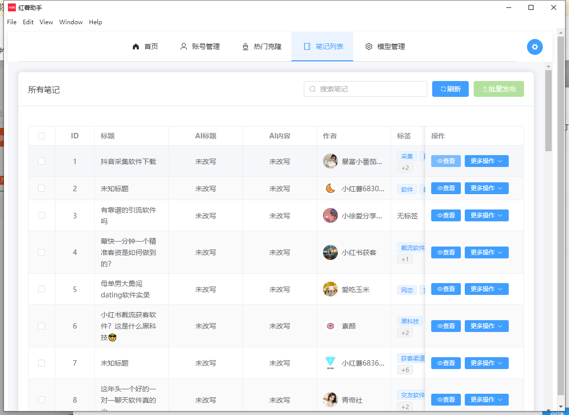 软件详细功能如下:DY AI矩阵克隆系统发布工具-购买自动发下载地址和卡密1.一键指定作者并下载克隆对方图文视频作品后自动去重处理,进行多个小红书矩阵账号批量发布.(可以提取同行爆火的笔记,结合AI智...
