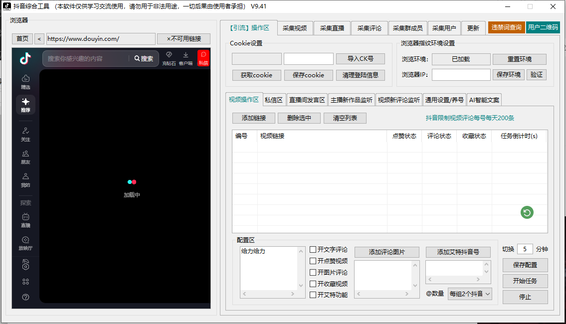 将采集到的id自动一键导入自动化操作区进行视频评论DZ 收藏,批量关注私信用户,批量导入直播间链接进行发言等功能。
